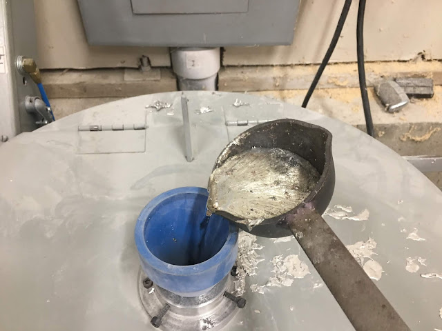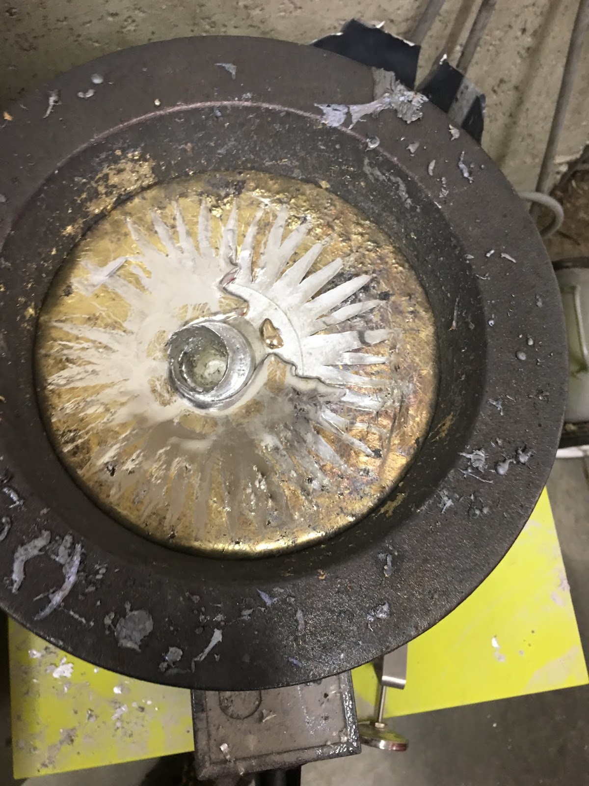 Metal is poured in place once the mold starts spinning. No time is wasted as the we want the metal as hot as possible. As it spins inside the mold, centrifugal force sends it to all corners of the mold.