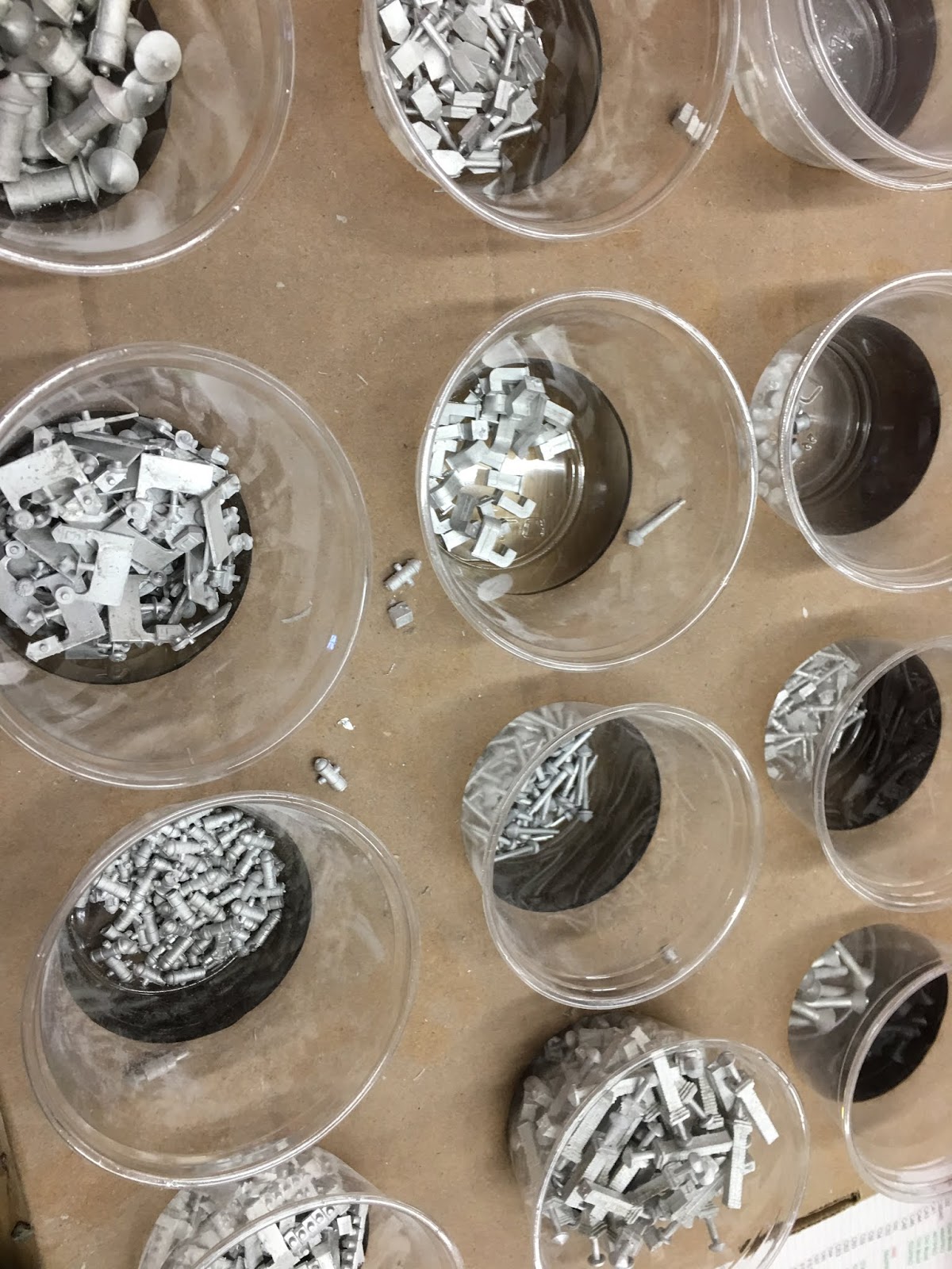 Parts are sorted as they are cast and eventually bagged specifically for each kit.