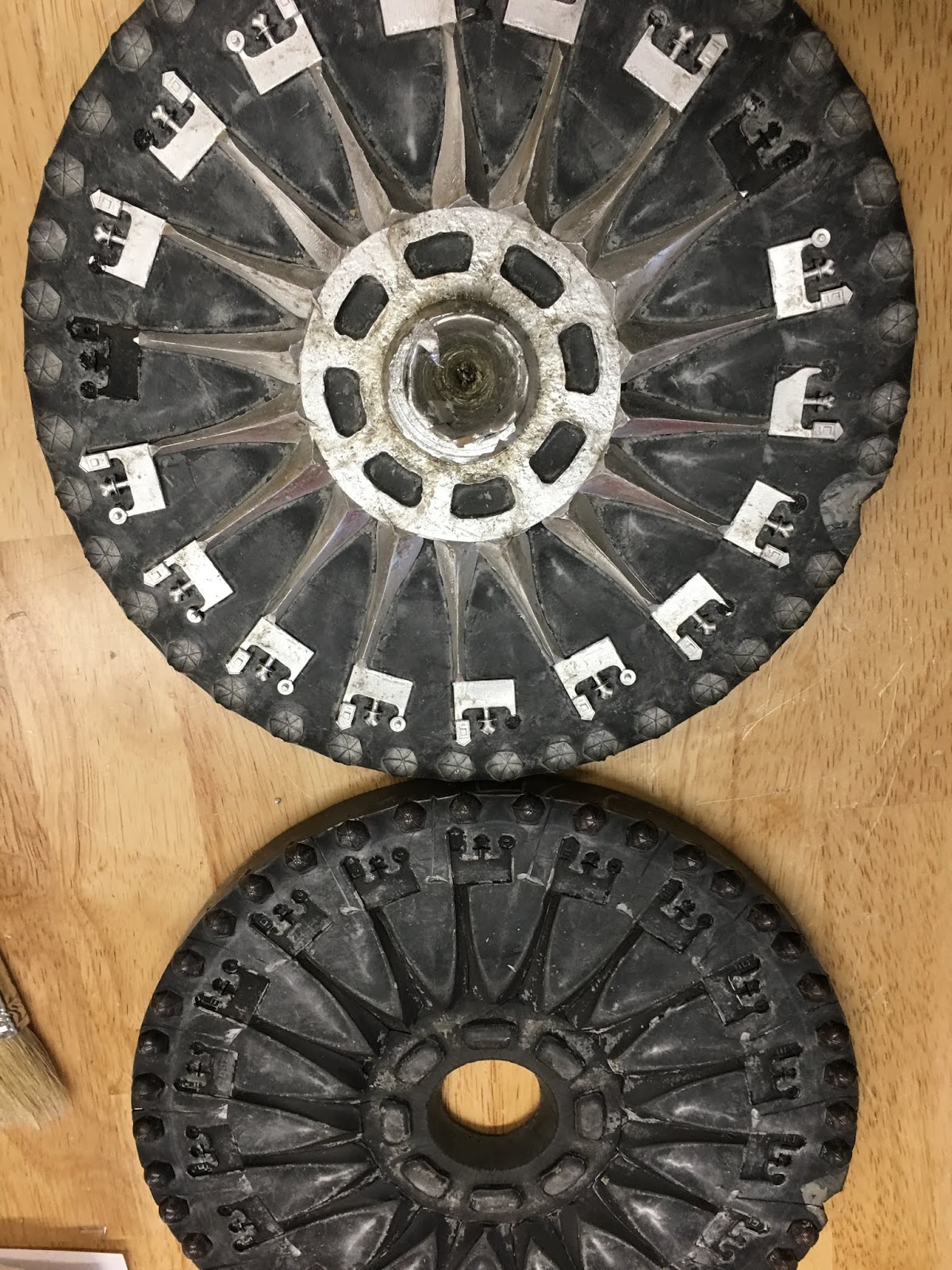 The mold is 9" round and is in two parts. The upper layer has a centered hole for the metal to pour into while the machine is spinning. By the way, these molds are very durable, the vulcanized rubber, made under extreme heat and pressure are similar to tire rubber. They can last many years; you can see above this one is 15 years old.