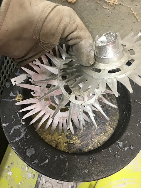 Once the parts are removed from the sprue, the excess metal is immediately put back into the pot to be re-used.
