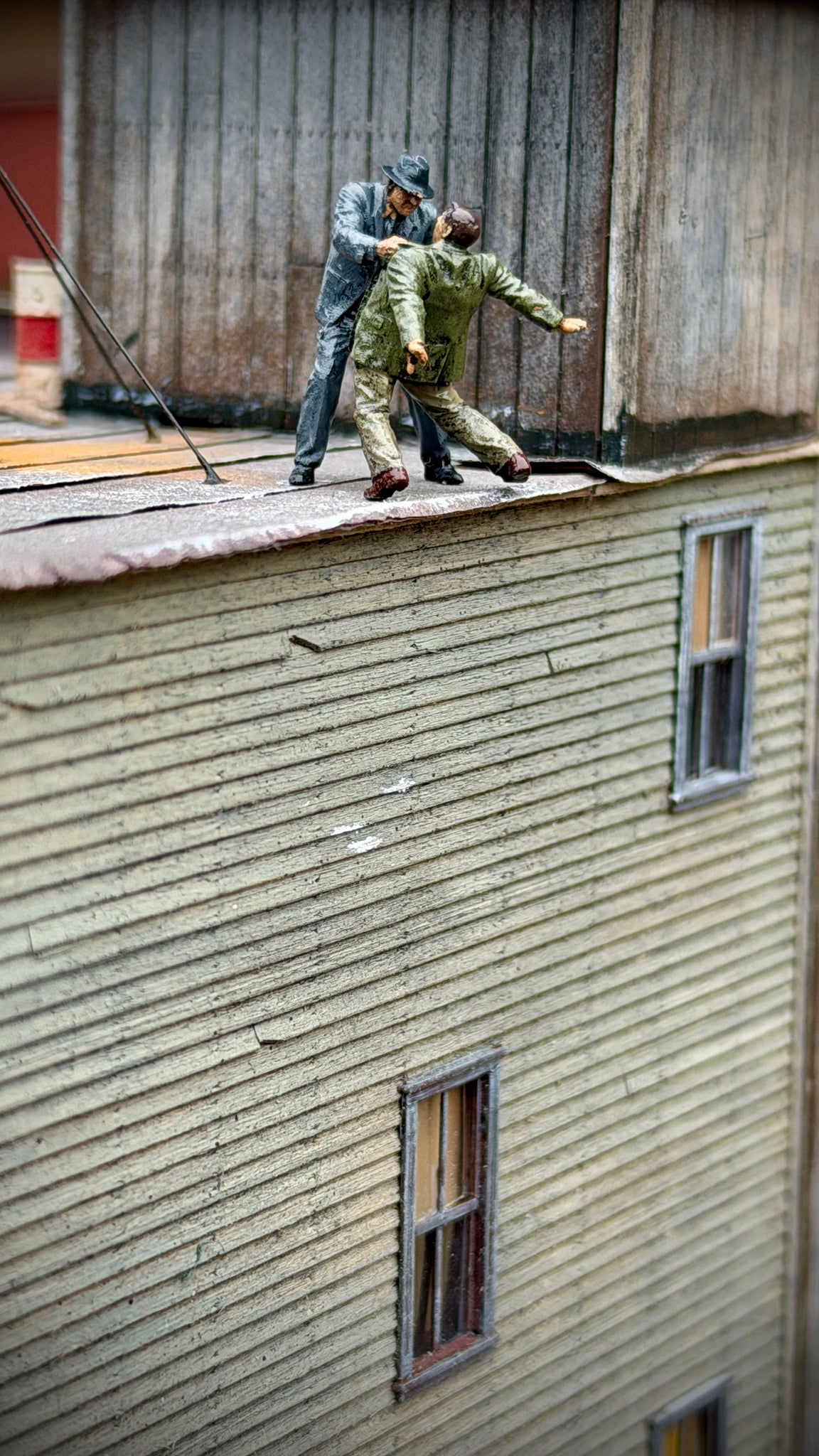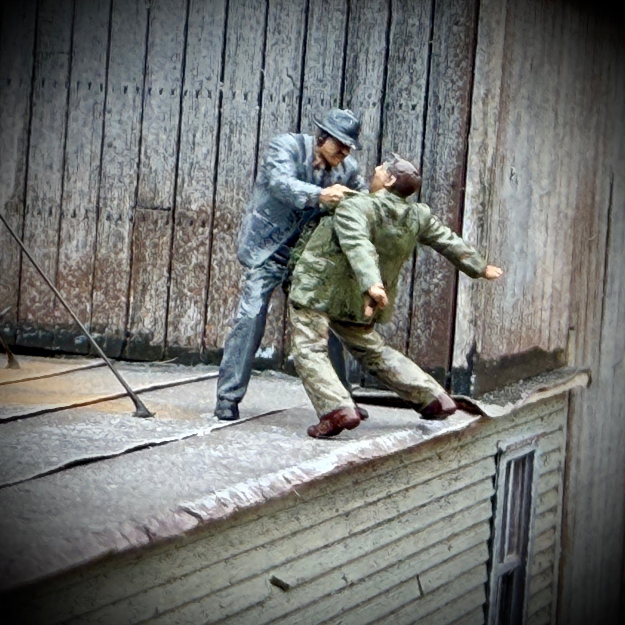 Caught in a split-second of tension, this dramatic two-figure scene tells a story that’s as old as the city itself—one man pushed too far, the other pushed even further. Teetering on the edge, arms thrown wide, there’s a moment here where everything hangs in the balance… and you already know how it’s going to end.